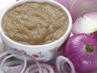 Луковая маска. Для приготовления понадобится мякоть лука или луковый сок (2 столовые ложки), репейное масло (2 ложки) и мед (1 ложка) – для сухой и кефир (2 столовые ложки) – для жирной кожи головы. Ингредиенты тщательно перемешать, нанести на голову, надеть полиэтиленовую шапочку и оставить на 20-30 минут.