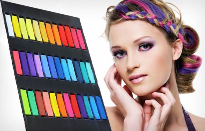 Вариант для девушек, которые не готовы к кардинальным переменам, но жаждут заполучить новый цвет хотя бы на несколько часов, до ближайшего мытья головы. Специальные разноцветные мелки подходят блондинкам и брюнеткам, хотя в первом случае смотрятся на волосах ярче. Важное преимущество: предварительное осветление локонов, как в случае с краской, не требуется.