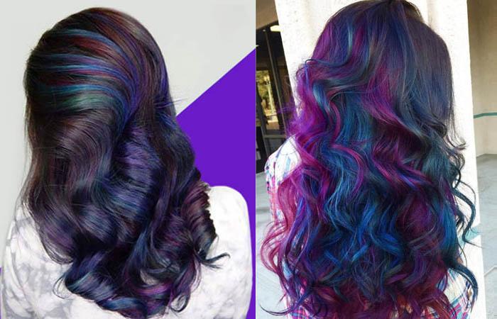 «Нефтяное пятно» — техника, которая больше подходит брюнеткам и шатенкам. Сочетание синего, фиолетового, зеленого при ярком освещении создает на волосах эффект бензиновых разводов на асфальте. К тому же, не требуется обесцвечивание.