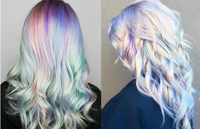 Волосы цвета опала — на тот случай, когда определиться с одним пастельным оттенком сложно. Красивые переливы жемчужного, лососевого, небесно-голубого и других цветов, имитирующих блеск натурального камня, смотрятся волшебно.
