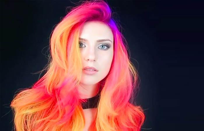 Цветное окрашивание – это окрашивание волос в яркие цвета, альтернативные натуральным, такие как красный, синий, зелёный, желтый, розовый, оранжевый и так далее. Выполняется такое окрашивание в два этапа: первый этап – осветление волос, второй этап – наложение цветного оттенка.