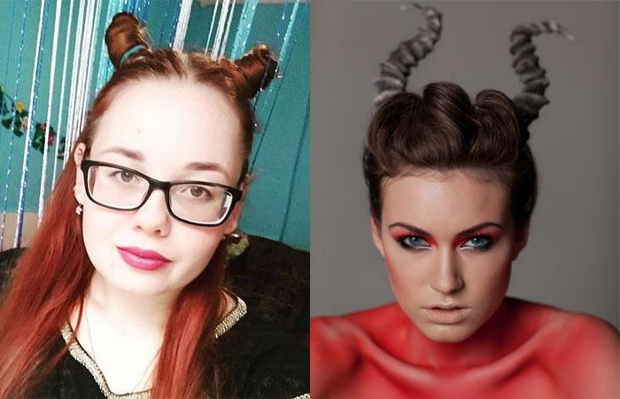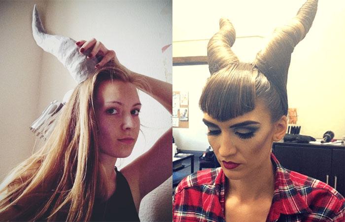 С выходом в прокат фильма «Малефисента» копилка идей для Хэллоуина пополнилась образом главной героини, которую сыграла очаровательная Анджелина Джоли. Прическа с огромными рогами на голове стала одной из любимых у обладательниц длинных волос. Сделать «фальшивые рога» очень просто, когда под рукой расческа, стойкий лак для волос и немного невидимок. Небольшие рожки можно сделать из собственных прядей, накручивая их вокруг себя.