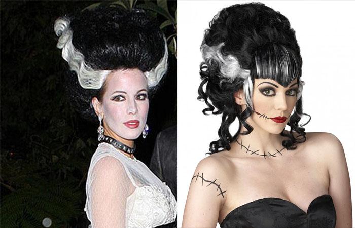 «Невеста Франкенштейна» — еще один неповторимый и подходящий вариант для креативных личностей. Прическа идеально смотрится на темноволосых красавицах и легко выполняется. Нанесите мусс для фиксации на волосы у лица, дополнительно побрызгайте лаком и высушите феном. Они должны быть подняты вертикально («стоять»). Волосам сзади придайте объема с помощью легкого начеса.