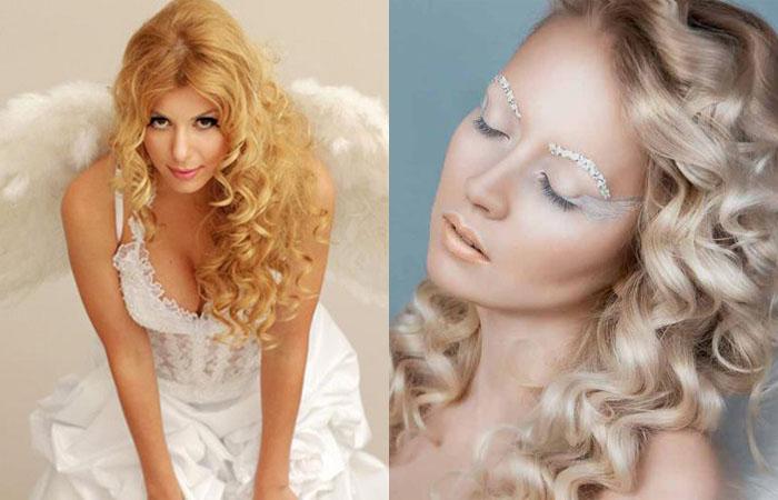 «Ангелочек» — удачный вариант убранства на Halloween. Прическа в этом случае может быть представлена мелкими кудряшками и ослеплять сиянием и блеском. Выполняется просто: локоны накрутите на мелкие бигуди, спиральную плойку. Но не забудьте о блестках.