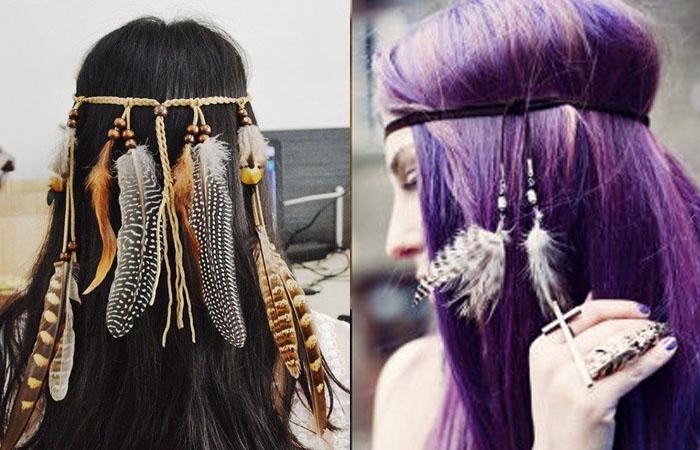 Ободок с перьями на фоне фиолетовых, синих волос выглядит смело и загадочно.