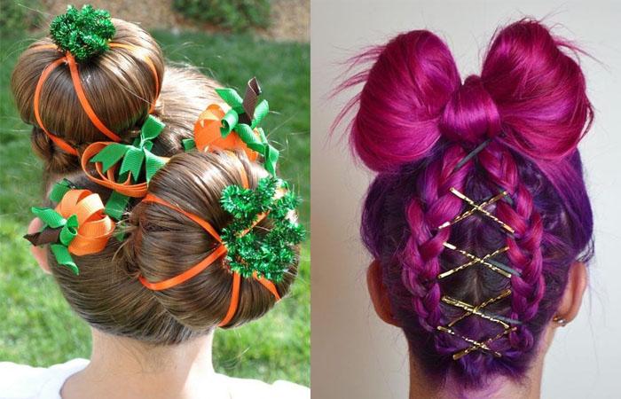 Тыква — неизменный атрибут Хэллоуина. Еще древние кельты, основоположники праздника, отпугивали нечистую силу этим плодом, зажигая внутри него огонь. Прически с тыквами остаются актуальными в наши дни, смотрятся ярко и нарядно. Сделайте два асимметричных пучка, украсьте их оранжевыми и зелеными лентами.