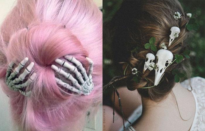 Необязательно делать замысловатые прически. Пучок, украшенный кистями скелета или небольшими заколками-черепами, тоже хорошо смотрится. В этом случае стоит постараться в поиске экстравагантного украшения.