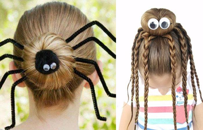 Еще один, не менее выразительный паучок получится, если собрать волосы в высокий хвост. Выделите 8 прядей, заплетите из них 8 косичек (это будут лапки паука). Из оставшихся волос сделайте пучок, украсьте его спереди глазами.