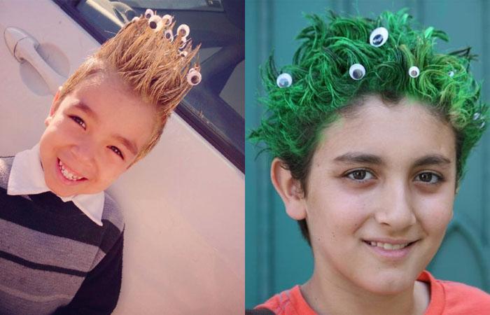 Для мальчишек можно приподнять волосы вертикально (сделать это поможет лак сильной фиксации и сушка феном). На кончики прядей прикрепите глазки для игрушек. Такая прическа то, что нужно на веселый и шумный праздник.