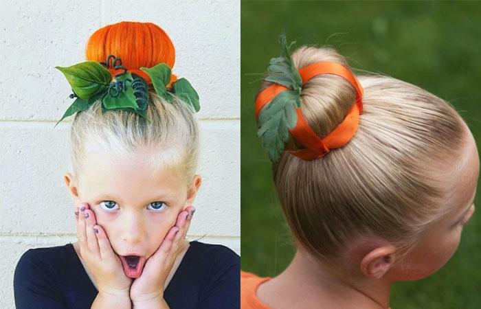 Пучок в виде тыквы — удачный вариант для Хэллоуина. Концы волос окрасьте в оранжевый цвет с помощью специальных мелков. Соберите пряди в высокий пучок. Украсьте основание «тыквы» листочками. Просто и ярко!