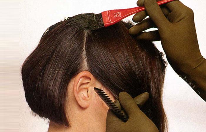 Подсказка. Если окрашивание повторное и корни уже отрасли, сначала смесь наносится на отросшие у корней участки, дальше выжидается время (около 20 минут), затем пигмент распределяется по всей длине волос.