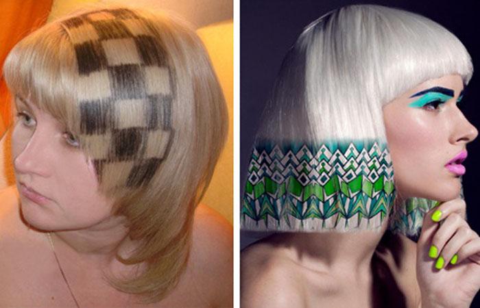 Как правило, для этого используются недолговечные красители, которые быстро смываются. Чтобы рисунок выглядел так, как задумано, локоны выпрямляются, а сам принт наносится через подобранный шаблон (трафарет).