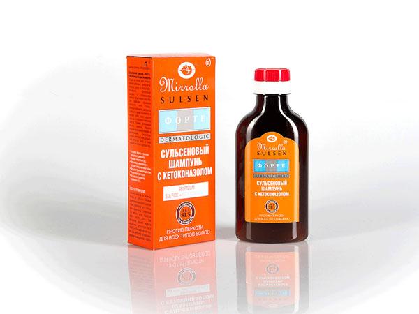 - Шампунь сульсеновый «Форте» с кетоконазолом. Активным компонентом флаконов в 150 и 250 мл выступает кетоконазол, который оказывает пагубное влияние на грибок.