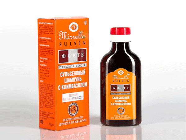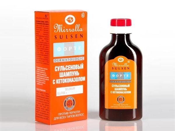 - Мирра «Сульсен Форте». Целебная суспензия объёмом 250 мл заключена в тёмную бутылочку. Продаётся средство 1 и 2% дисульфида селена (в первом случае шампунь рекомендован для профилактики, во втором — для лечения). Целебная косметика имеет приятный аромат трав. В формулу включены отдельные экстракты, способствующие улучшению состояния волос. Применять нужно каждые 3 дня.