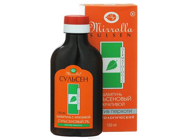 - Дерматологический шампунь Миролла. Этот продукт производитель рекомендует чередовать с пастой Сульсена. Флакона в 250 мл будет вполне достаточно для прохождения 2-х месячного курса терапии.
