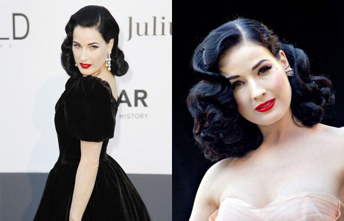 Стиль пятидесятых востребован знаменитостями. Девушки любят щеголять в винтажных платьях, делать характерные прически. Яркой почитательницей образов в духе середины XX века называют Диту фон Тиз.