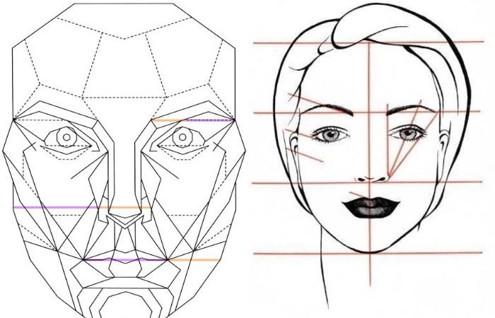 - ширина овала на уровне глаз должна ровняться длине глаза, умноженной на 5, а расстояние между внутренними уголками глаз должно быть равным длине одного глаза, длина же от внешнего угла глаза до края овала также должна равняться длине глаза;