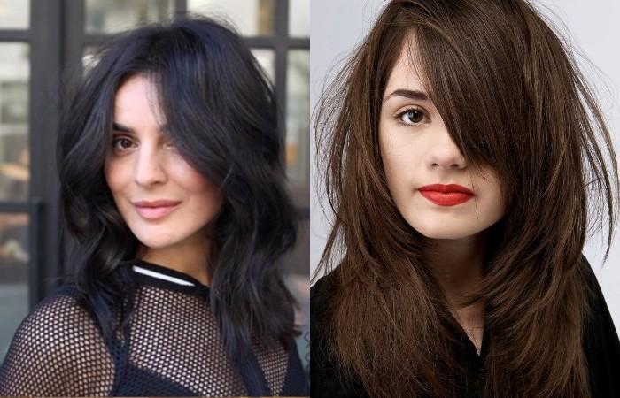 - рекомендуется использовать асимметричные челки разной формы и длины, отличным решением станет прямая филированная, с удлинением, противопоказана густая ровная челка, а воздушная градуированная позволит визуально сузить нос, скрыть горбинку при определенных ракурсах;